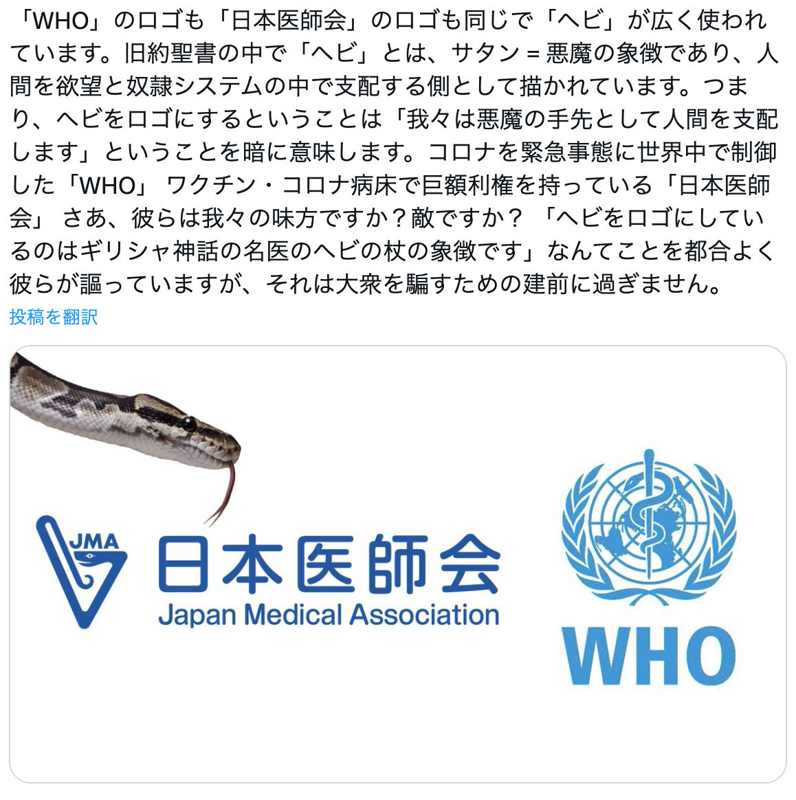 2024年5月7日、「『WHO』のロゴも「日本医師会」のロゴも同じで『ヘビ』が広く使われている。旧約聖書で『ヘビ』とは、サタン = 悪魔の象徴であり、ヘビをロゴにするということは『悪魔の手先として人間を支配します』ということを意味する」と主張する言説が拡散した。WHOと日本医師会のロゴの画像も添付されている。