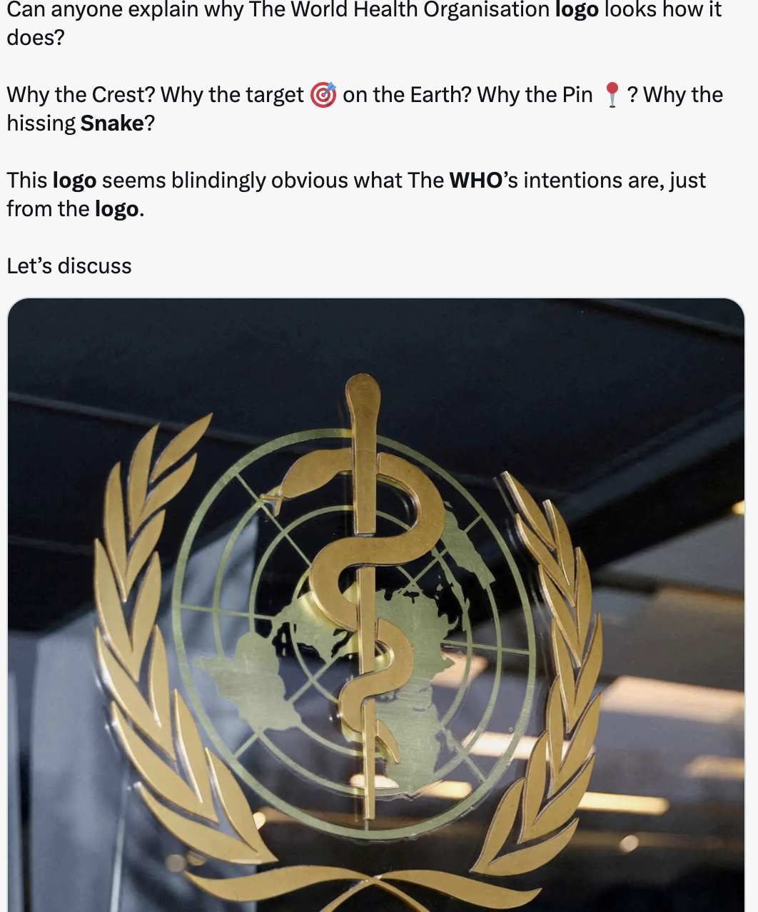また、海外のアカウントでも、このロゴを使って、「なぜ地球をターゲットにしているのか、なぜピンで刺しているのか、なぜ舌をだす蛇なのか、WHOの意図は一目瞭然だ」という英文の投稿がある。
