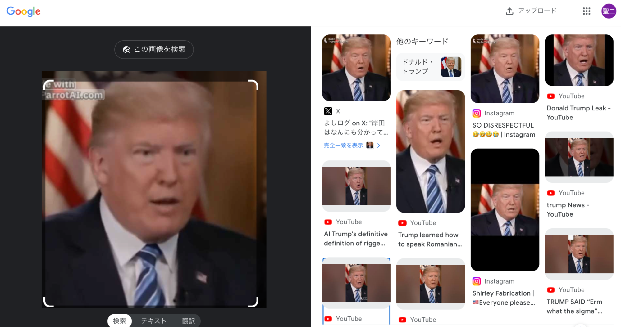 このトランプ氏の発言の映像の一場面をGoogle画像検索にかけるとYouTubeやインスタグラムなどで複数見つかるが、それぞれ再生してみると話している内容が異なる。中には、同じ映像でトランプ氏の声にもかかわらず、ルーマニア語で語っているものもあった。
