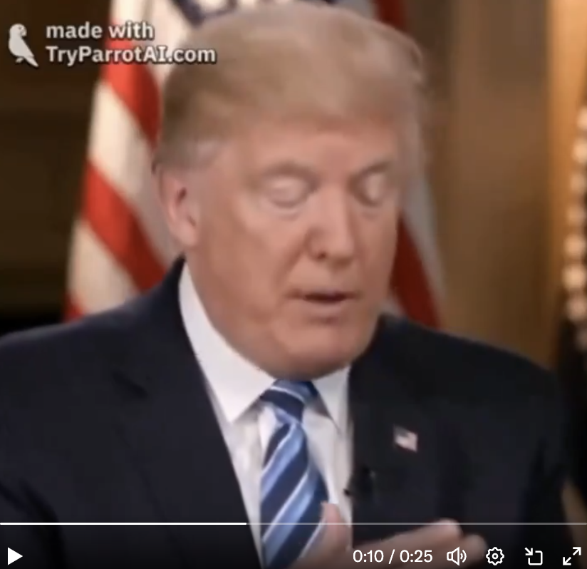 拡散した動画は、左上に「made with TryParrotAI.com(TryParrotAI.comにより作成)」と書かれている。このサイトはトランプ氏やバイデン大統領、オバマ元大統領ら著名人をリストから選び、語らせたい言葉を打ち込むと、本人そっくりの音声付き動画がAIで生成される。