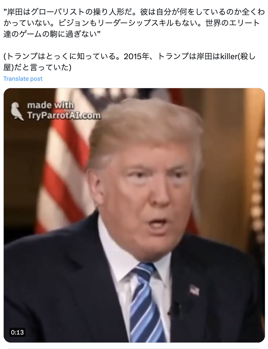 2024年4月29日に、X(旧Twitter)でアメリカのトランプ前大統領が岸田首相をおとしめるような言葉を語る動画が拡散した。この25秒の動画の中でトランプ氏は、「日本の総理大臣の岸田文雄は、大変災難なことに、グローバリストの操り人形(パペット)にすぎず、ビジョンもリーダーシップのスキルもない、日本を愛するナショナリスト安倍晋三とは大違いだ」などと英語で話している。