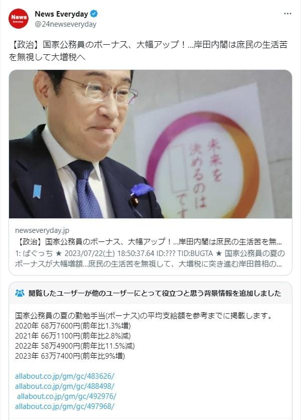「国家公務員のボーナス、大幅アップ!…岸田内閣は庶民の生活苦を無視して大増税へ」というツイートが拡散した。表示回数47万件、とリツイート2000件を超えている。