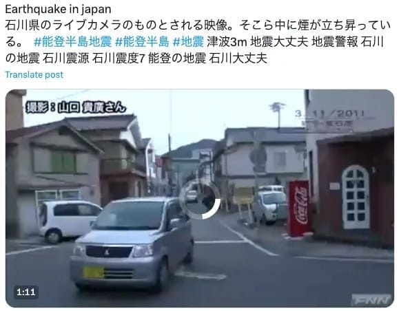 災害時に最も多く見られるのが、偽の被害報告だ。2024年1月1日の能登半島地震では、2011年の東日本大震災の津波の映像を使って、まるで能登半島地震の被害のように投稿する事例が相次いだ(例1、例2、例3、例4、例5 、例6)。