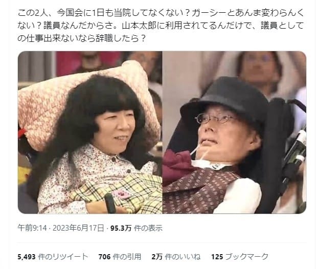 2023年6月17日、「この2人、今国会に1日も当院してなくない?」「議員としての仕事出来ないなら辞職したら?」というツイートが、両議員の写真と共に拡散した。6月28日時点で、ツイートは、99万件を超える表示回数と5000件を超えるリツイートを獲得している。