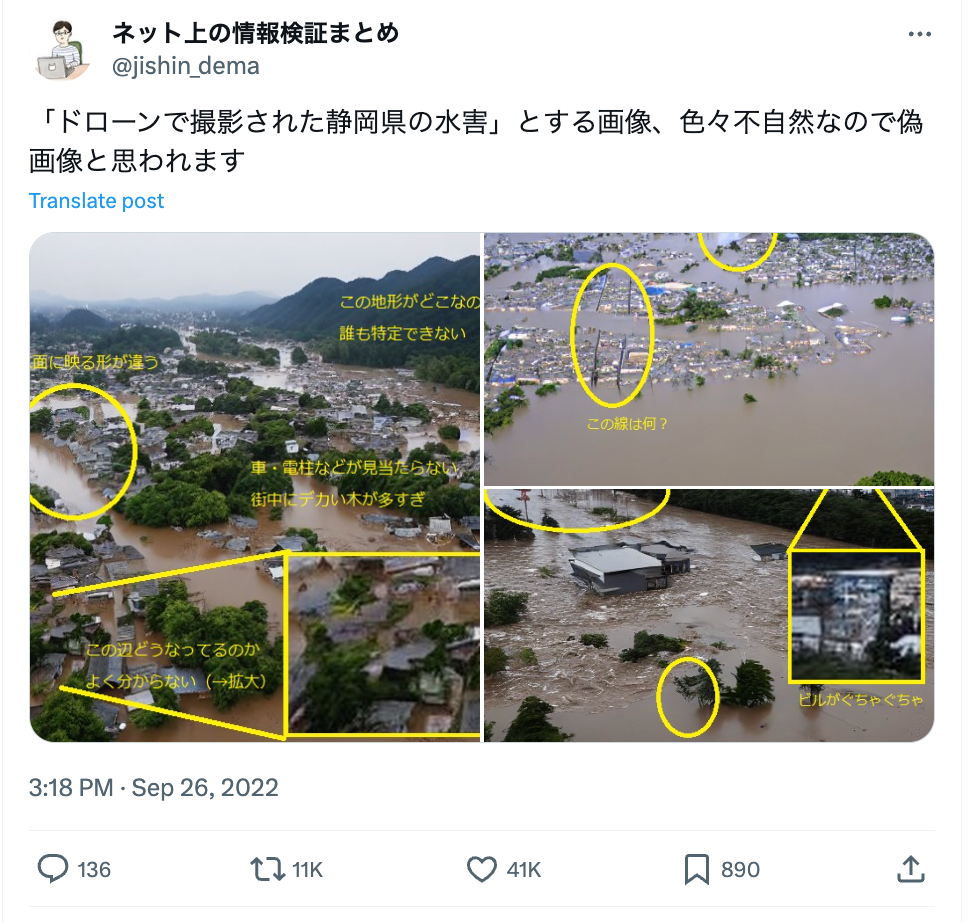 台風15号による記録的な大雨に見舞われた静岡県をドローンで撮影したとする画像がTwitter上で拡散しています。しかし、これはAIで作られた画像で、後から投稿者も偽画像だと認めています。AI作成の画像を見抜くポイントの解説とともに検証します。