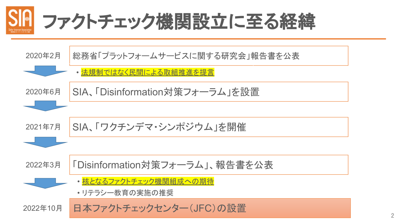 ネット上の違法・有害情報対策に取り組むために国内ネット企業を中心に構成するSIAは、有識者を集めて「Disinformation対策フォーラム」を設置。そこでの議論をもとにJFCを設立しました。