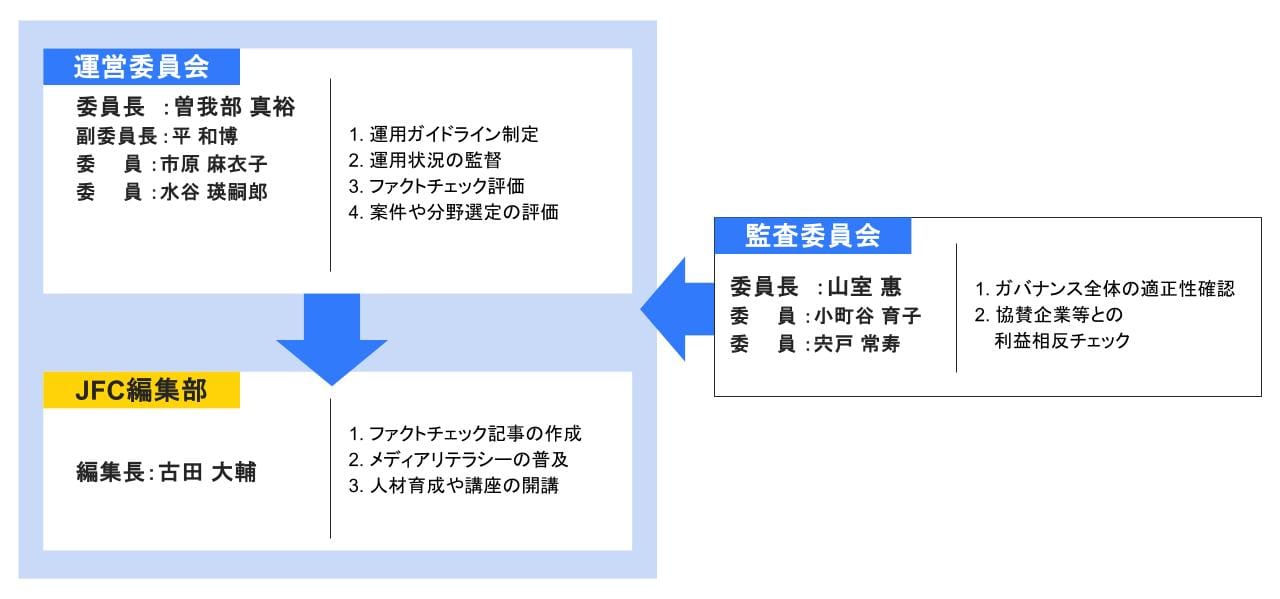 運営委員会はJFCが定めるファクトチェックガイドラインに則って編集部が検証を実施しているかを評価し、編集長の解任を理事会に勧告する権限も持っています。また、運営委員会と編集部全体のガバナンスが適正か確認する監査委員会も設けています。