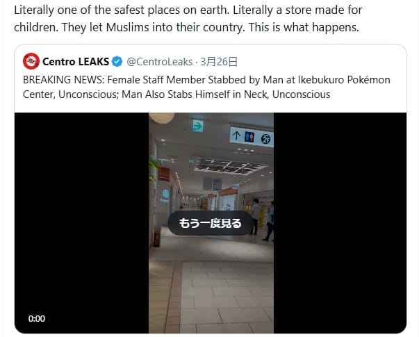 On March 31, 2026, an English post on X began circulating alongside a video of the incident at the Pokemon Center. The post stated: "Literally one of the safest places on earth. Literally a store made for children. They let Muslims into their country. This is what happens."