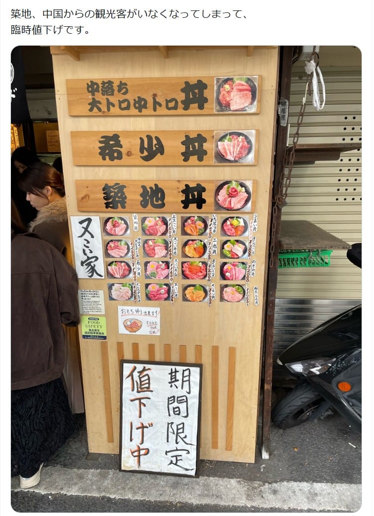 On November 25, 2025, a post with an image circulated stating, "Emergency price cuts at Tsukiji, where Chinese tourists have disappeared."