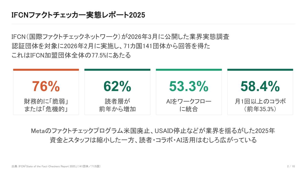 IFCNの加盟団体を対象に2026年2月にアンケート、71カ国141団体から回答を得ました。回答率はIFCN加盟団体の77.5%。毎年恒例の公開で、過去分は2024年版で解説しています。