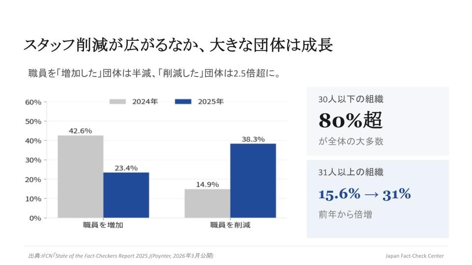 2024年には約半数の団体が収入の増加を報告しましたが、2025年は45.3%が収入の減少を報告しました。ファクトチェックに対して否定的なトランプ政権の誕生によって予想された「逆風」が現実となりました。