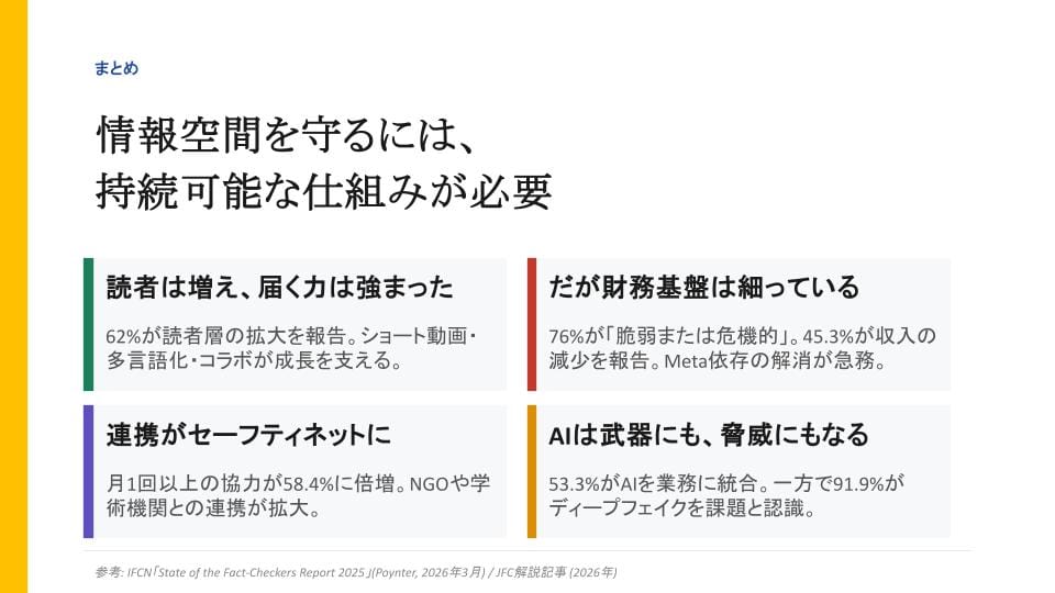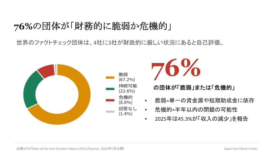 レポートが示すのは、ファクトチェック業界が「より多くの人に届く力」を高めた一方で、それを支える財務基盤は著しく脆くなっている、という構造的な矛盾です。