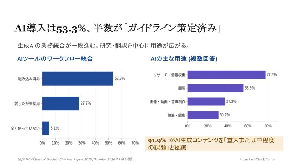 AI企業との正式な契約を結んでいる団体はわずか2.9%で、前年の5%から減少。AIクローラーによる自社コンテンツのスクレイピングをブロックしている団体も14.6%にとどまります。プラットフォーマーとAI企業に対して、ファクトチェック業界としてどう関係を設計するかは、引き続き未解決の課題です。