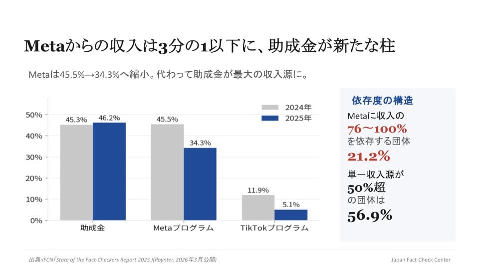 Metaのプログラムに参加している団体は、61.4%から56.2%に減少したものの、依然として大きな存在です。参加団体の21.2%が収入の76〜100%をMetaに依存しており、16.5%が51〜75%を依存しています。米国での廃止がアジア・欧州・中南米に拡大すれば、影響はさらに大きくなります。