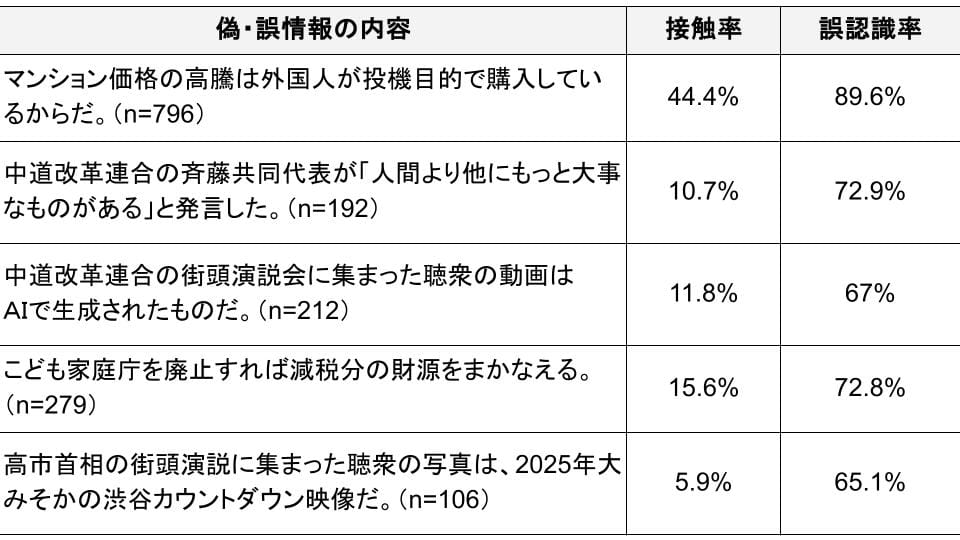 5つの選択肢の中で、接触経路としてテレビが最多だったのは、「マンション価格の高騰は外国人が投機目的で購入しているからだ」(41.7%)と「高市首相の街頭演説に集まった聴衆の写真は、2025年大みそかの渋谷カウントダウン映像」(26.4%)の2件でした。