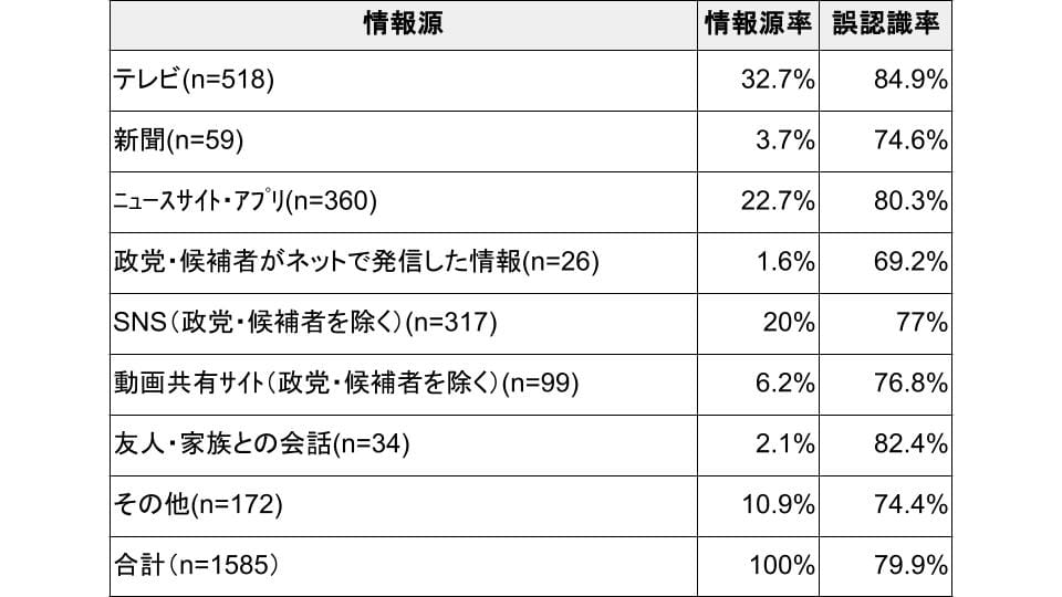 回答者の51.4%が選挙期間中に偽・誤情報に接触したと答え、しかも、接触した偽・誤情報1585件の79.9%を事実だと誤認識していました。中でも、最も注目を集めたのは、偽・誤情報の接触経路として「テレビ」と答えた人が最も多く32.7%を占めたことです。