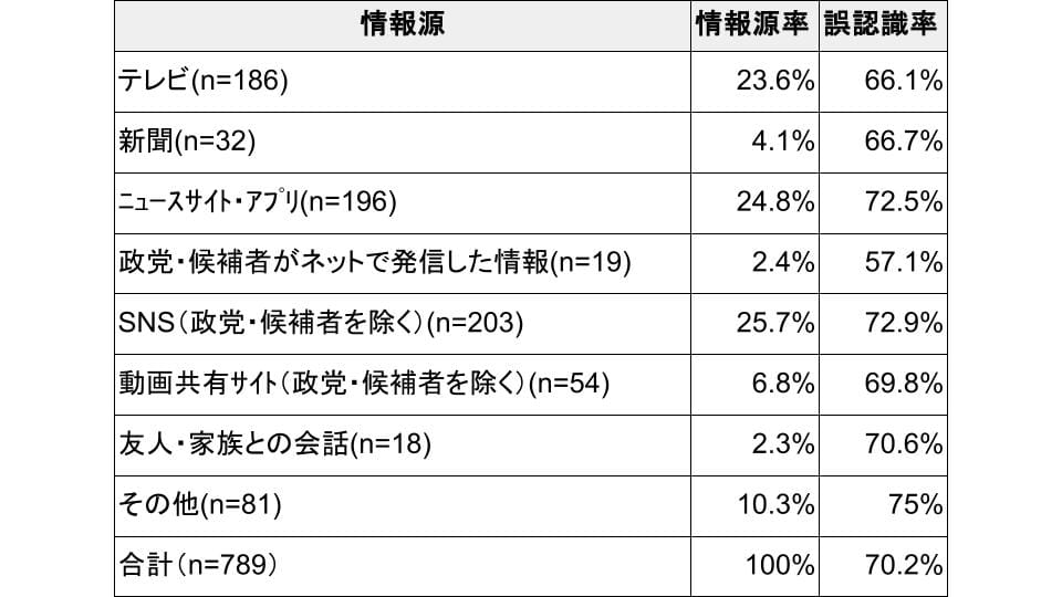 この項目については、ニュースサイト・アプリが89.0%、SNS(候補者・政党を除く)が88.6%と、いずれも誤認識率が非常に高いです。これを除いた4件の偽・誤情報で見てみると、テレビの誤認識率は66.1%。その他75%、SNS72.9%、ニュースサイト・アプリ72.5%よりも低い数字です。これはこの選択肢について、他とは違う傾向があった証とも言えます。