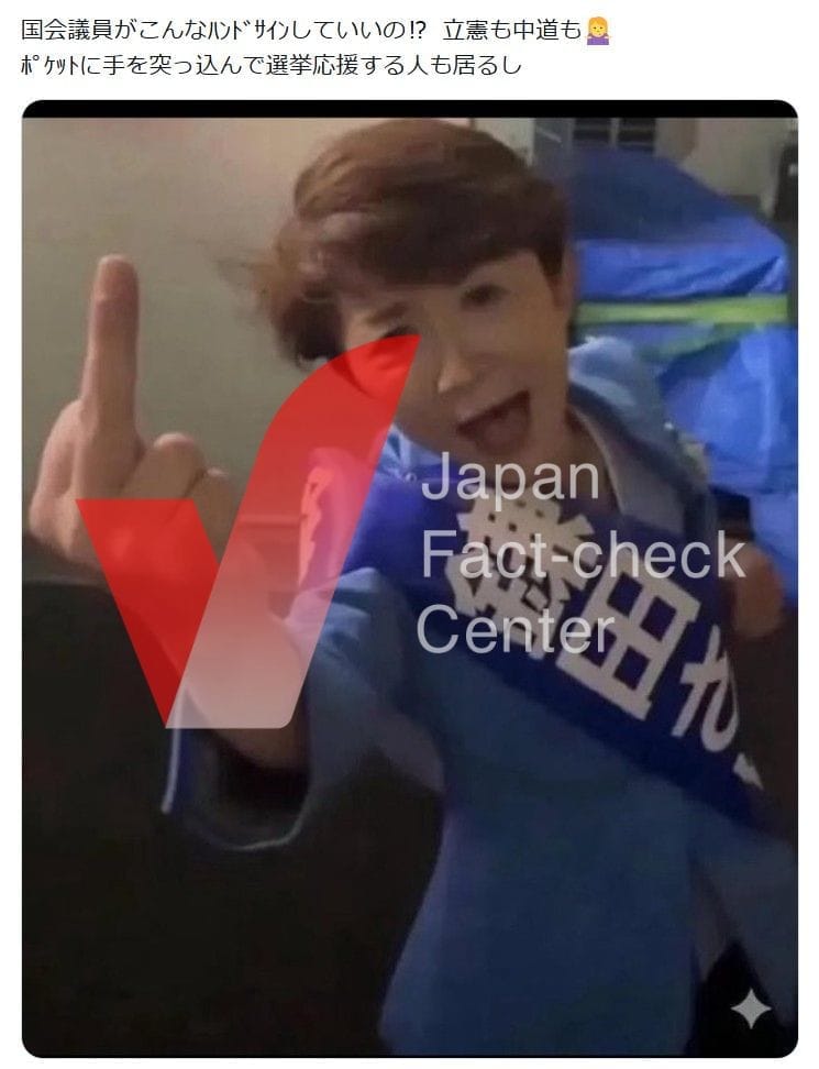 JFC”中道・鎌田さゆり氏が中指を立てる画像? AI生成による改変”