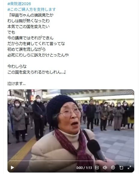 ディープフェイクは政党や政治家を貶めるだけでなく、称賛する方向でも使えます。例えば、JFCが検証した動画の中には「高市首相を熱烈に応援する高齢者」というものがありました。