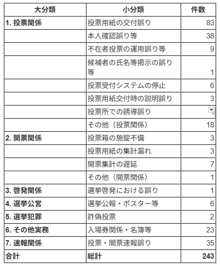 投票用紙の交付の誤り83件、本人確認の誤り等38件など、問題事例を表にすると、以下の通りだ。
