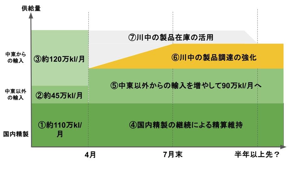 このうち③がホルムズ海峡の封鎖でゼロになりました。120万kl/月の不足分について、②の「中東以外からの45万kl/月」を2倍の90万kl/月にしても補い切れません。だから、政府は⑥の「川中製品の調達の強化」と⑦の「川中製品の在庫の活用」をすることで、従来の月280万klを満たそうとしています。