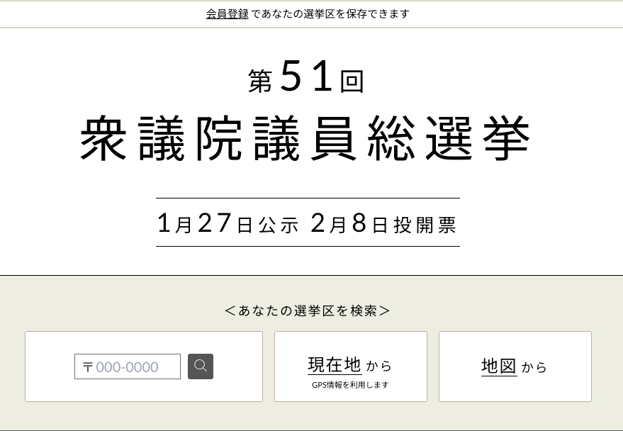 第51回衆議院議員総選挙の特集ページでは、郵便番号を入力するだけで自分の選挙区の候補者のプロフィールや活動記録、動画や政策アンケートの回答などをまとめて確認できます。