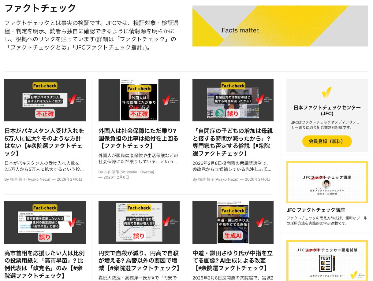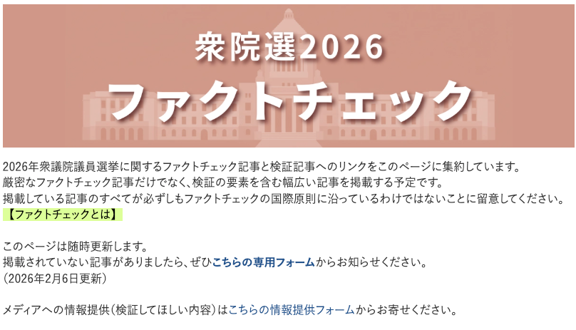 ファクトチェックの普及を推進するNPO「ファクトチェック・イニシアティブ」は、2026年衆院選に関係するファクトチェック記事一覧を公開しています。日本ファクトチェックセンター(JFC)などファクトチェックの専門機関や新聞やテレビなどのファクトチェック記事や関連記事をまとめて見られます。