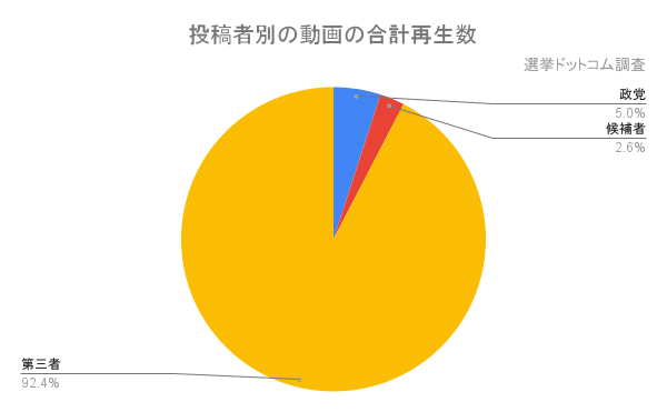 そのうち、92.4%(3億6500万回)が、政党や候補者ではない第三者が投稿した動画でした。一方、政党による動画は5%(1980万回)、 候補者による動画は2.6%(1033万回)にとどまりました。