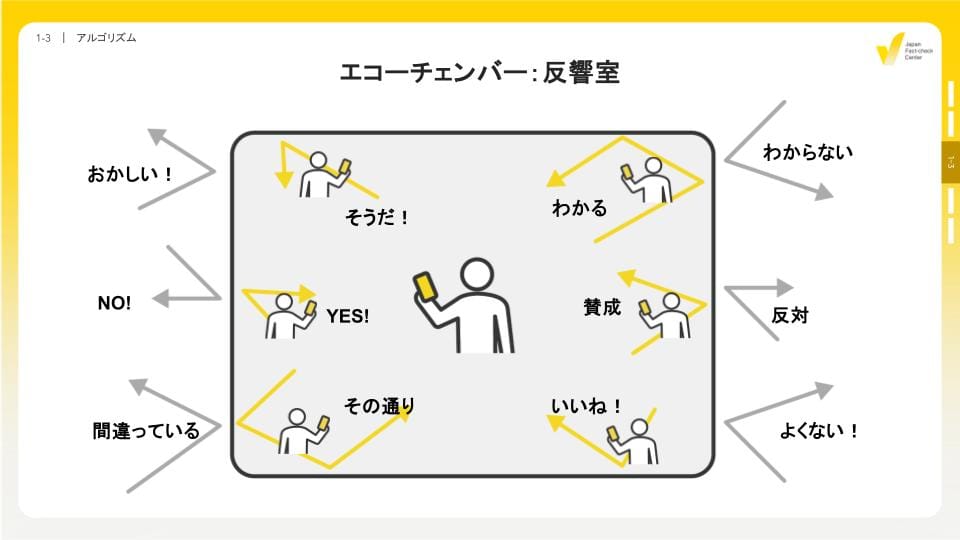これがアルゴリズムというフィルター(膜)で、バブル(泡)に包まれた井の中の蛙になってしまう「フィルターバブル」であり、自分と似たような人たちの声ばかりが聞こえる狭い部屋に入れられたような状態になる「エコーチェンバー(反響室)です。