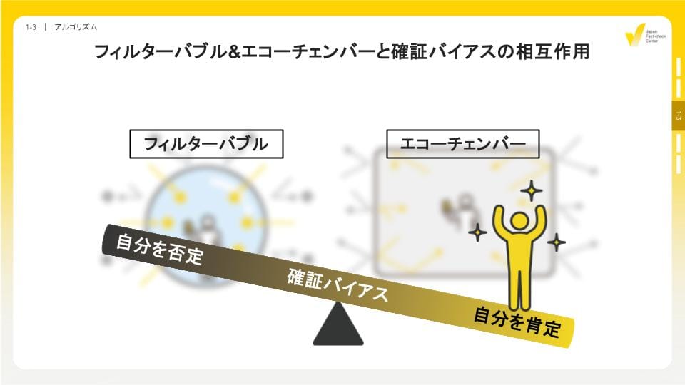 フィルターバブルやエコーチェンバーは、自分の考えや趣味嗜好に近い情報や人を近づけてくれるため、その人にとって心地よく、確証バイアスを強化していきます。そして、知らず知らずのうちに偏りはさらに強化されてしまいます。