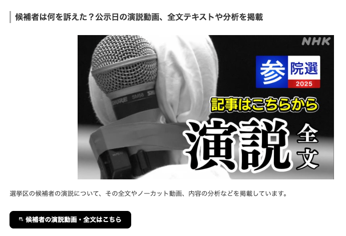 NHKは今回、非常に意欲的な選挙報道に取り組んでいます。その一つが、全候補者を候補者一人ひとりの演説をほぼノーカットで公開し、文字起こしも掲載するという試みです。ほとんどの候補を網羅し、各選挙区のページから探せます。