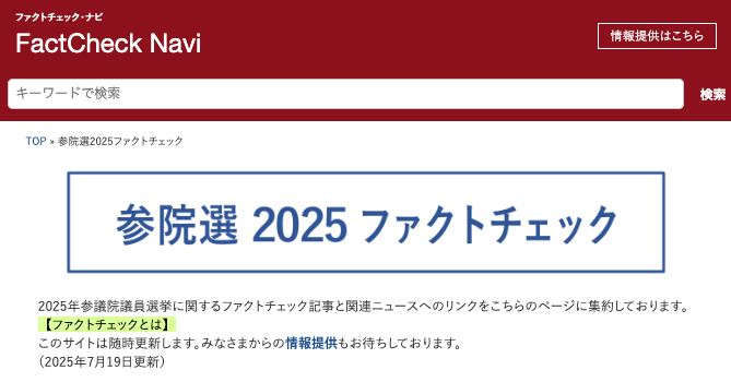 ファクトチェックの普及を推進するNPO「ファクトチェック・イニシアティブ」は、2025年参院選に関係するファクトチェック記事一覧を公開しています。日本ファクトチェックセンター(JFC)などファクトチェックの専門機関や新聞やテレビなどのファクトチェック記事をまとめて見られます。