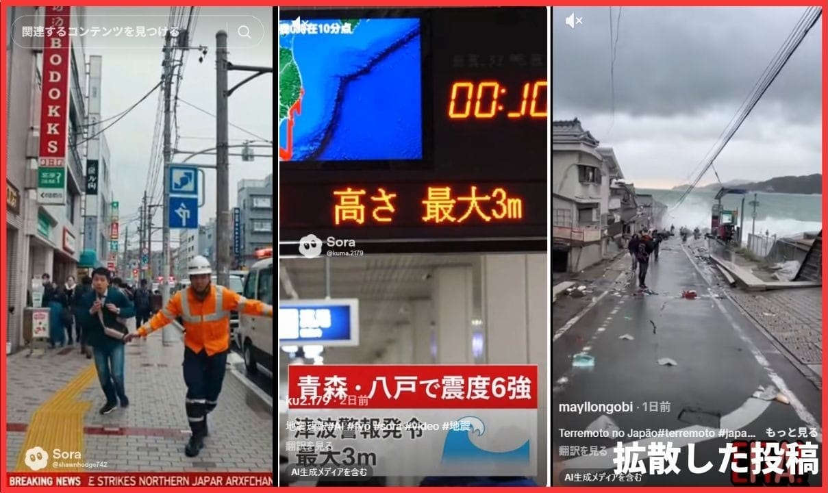 生成AIで作られた画像や動画を「ディープフェイク」と言う。12月8日に青森県東方沖で地震が発生すると、その直後からTikTokなどSNSで被害を訴える動画や、ニュース速報のように見せた動画が多数投稿された(例1、例2、例3)。