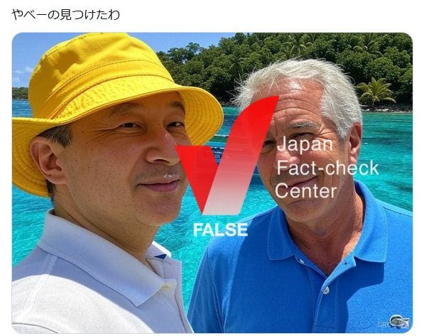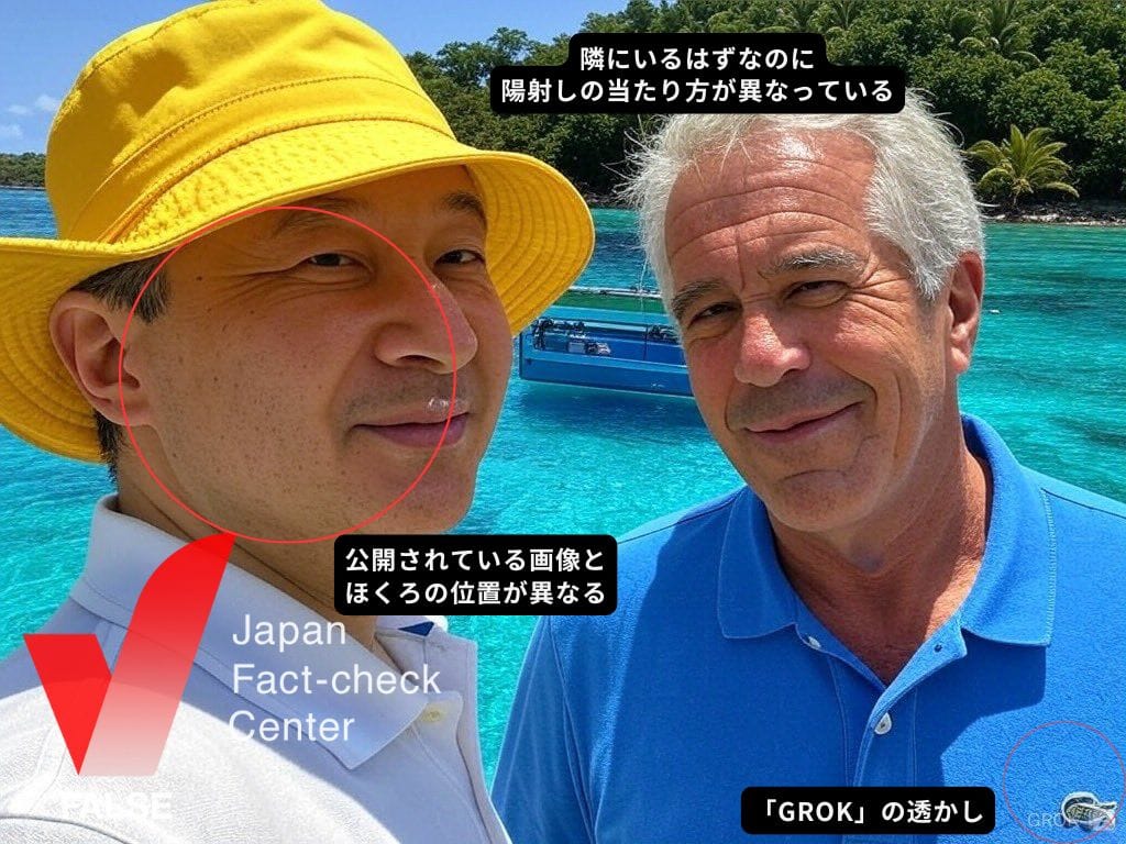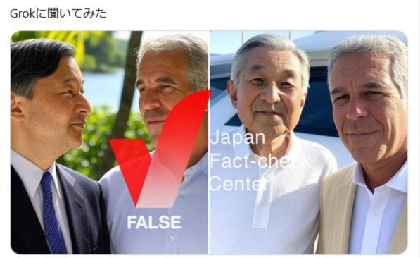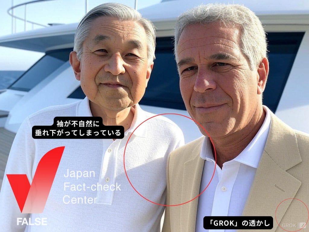 天皇陛下や上皇陛下がエプスタイン氏と共に写っている写真は捏造されたもので誤り。Xの生成AI「Grok」によって生成された、実際には存在しないフェイク画像だ。