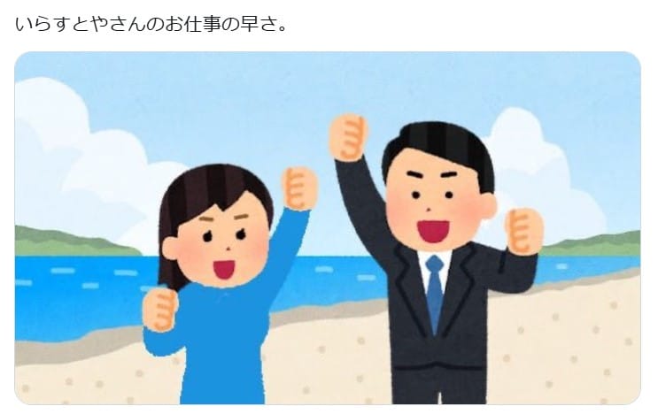 2024年11月28日、「いらすとやさんのお仕事の早さ」という画像付き情報が拡散した。男性と女性が砂浜で手を上げる画像が添付されている。
