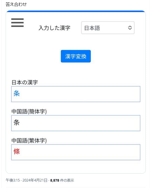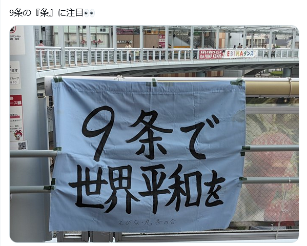 2024年4月21日、X(旧Twitter)で「9条の『条』に注目」というコメントと共に、「9条で世界平和を」と書かれた横断幕の画像が拡散した。画像の「条」の文字は、部首の「木」が「ホ(縦の棒ははねている)」と表記されている。