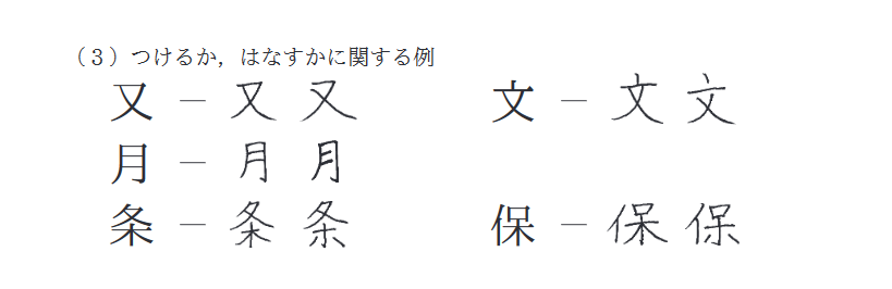 8ページには「筆写の楷書では、いろいろな書き方がある」として、「つけるか、はなすかに関する例」の一つに、「条」の字が取り上げられている。「条」の字の部首は、明朝体で「木」と表記される一方で、楷書では「ホ」と表記する例があるという。