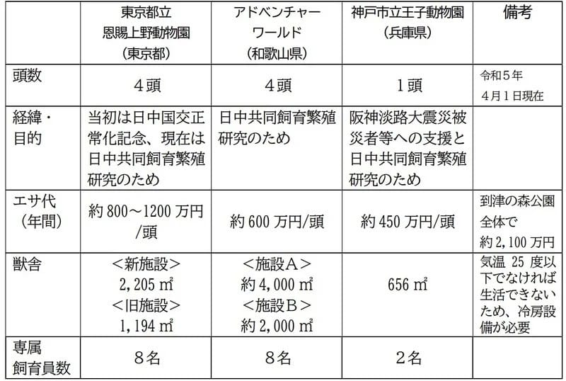 ジャイアントパンダのエサ代についてネット上では、福岡県北九州市建設局公園管理課が作成した表「ジャイアントパンダの誘致・飼育について」がある。この表に書かれているエサ代は動物園によって差があるが、1日あたりに換算すると1頭約1.2万~約3.3万円。9頭分にすると10万〜30万円となる。