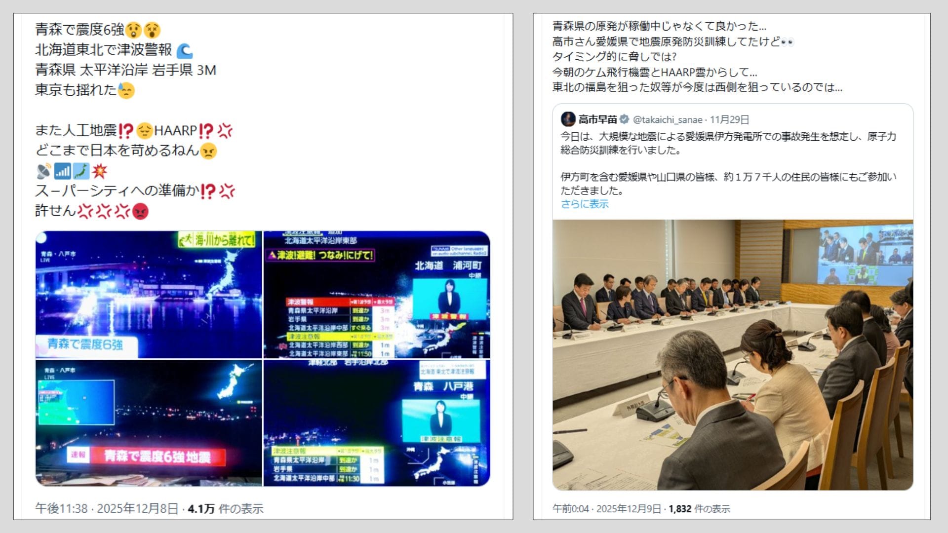2025年12月8日夜遅く、青森県東方沖を震源とする地震があり、青森県で震度6強の激しい揺れを観測した。この地震が人工地震であると示唆する投稿が多数拡散した(例1,2)。