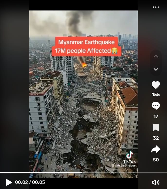 拡散した2つの動画はAIによって生成されたディープフェイクで、ミャンマー地震の被害映像だという主張は誤り。