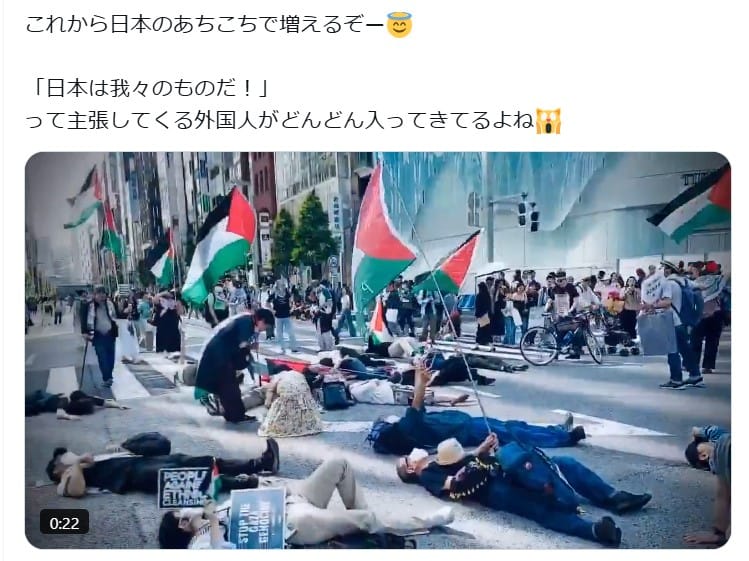 パレスチナ国旗を掲げて人が路上に寝転がる動画が「日本は我々のものだと主張する人々」かのように拡散しましたが、誤りです。動画はパレスチナの平和を求めるデモで「日本は我々のものだ」とは主張していません。