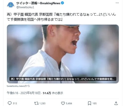 8月18日、「再)甲子園 韓国代表 京都国際『俺たち嫌われてるなぁって…けどいいんです優勝旗を祖国へ持ち帰るまでは』」という投稿がXで拡散した。