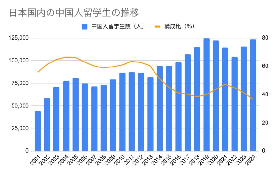 青い棒グラフが中国人留学生数、オレンジの折れ線が中国人留学生が留学生に占める割合を示す。中国人留学生の人数は、新型コロナの期間を除き、2001年度以降は概ね右肩上がりに増えてきた。最多は2019年度で、124,436人。