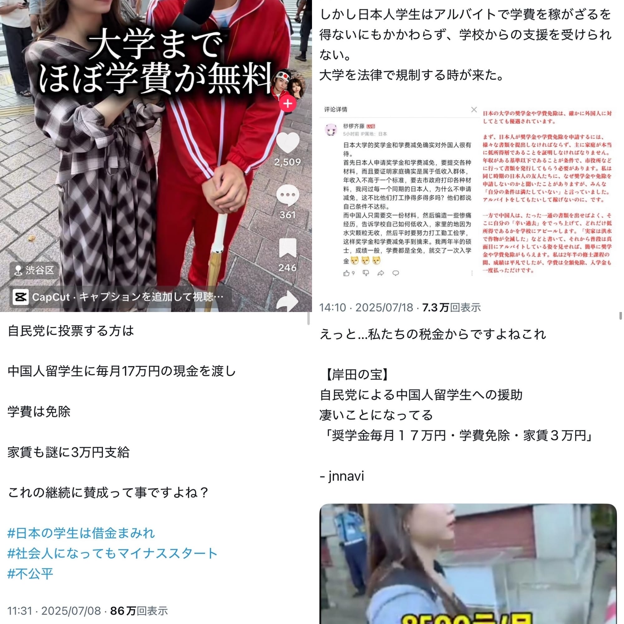 例2,3,4は「中国人留学生は、生活困窮をでっち上げるだけで学費免除」「中国人留学生に毎月17万円の現金を渡し 学費は免除」「自民党による中国人留学生への援助 凄いことになってる」などと主張している。