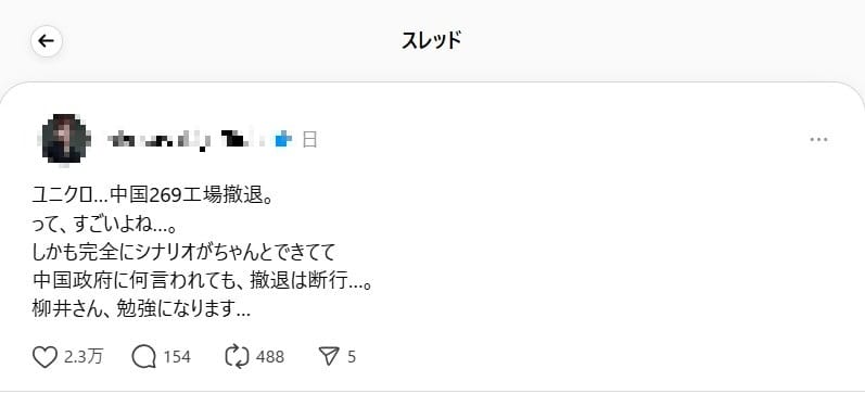 2025年5月8日現在、この投稿は480件以上リポストされ、いいね数は2.3万件を超える。投稿について「中国から工場撤退は良い話」「柳井さん見直しました」というコメントの一方で「ソースはどこ?」という指摘もある。