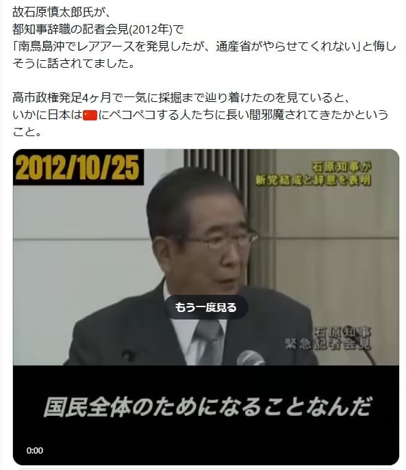 拡散した投稿は「高市政権発足4ヶ月で一気に採掘まで辿り着けた」と述べている。しかし、南鳥島沖のレアアース採掘は、内閣府の戦略的イノベーション創造プログラム(SIP)の一環として、長年にわたって進められてきた。