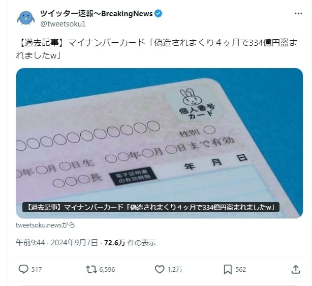 2024年9月7日、「【過去記事】マイナンバーカード『偽造されまくり4ヶ月で334億円盗まれましたw』」という投稿がX(旧Twitter)で拡散した。2024年9月10日現在、73万回以上の表示回数と6600件以上のリポストを獲得している。
