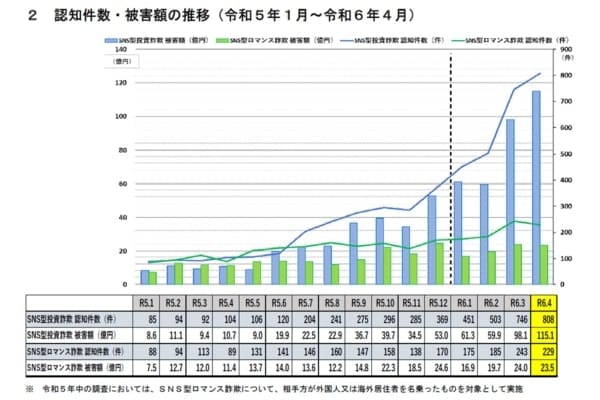 警察庁は2024年6月14日、SNS型投資詐欺などの認知・検挙状況に関する資料を公表した(「令和6年1月~3月におけるSNS型投資・ロマンス詐欺の認知・検挙状況等について」)。
