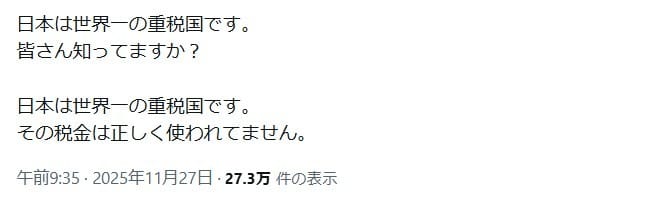 2025年11月27日、「日本は世界一の重税国です。皆さん知ってますか?日本は世界一の重税国です。その税金は正しく使われてません。」という投稿が拡散した。