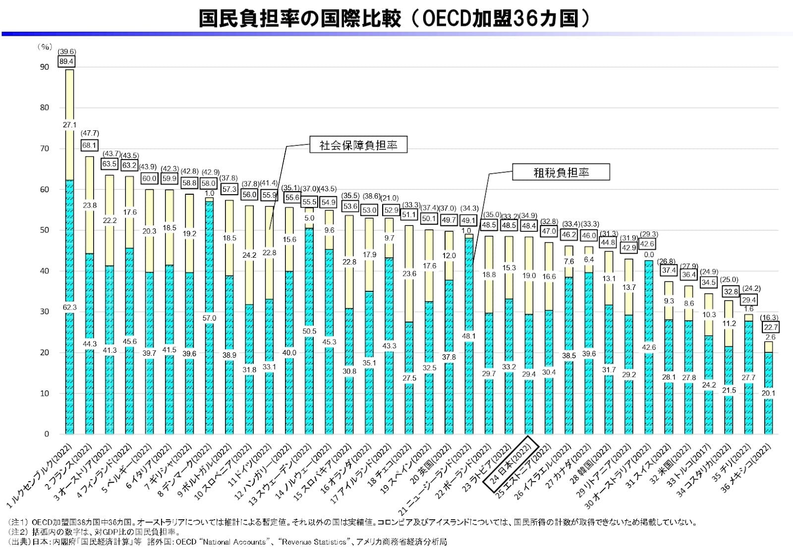 経済発展や途上国援助などを目的とした国際機関「経済協力開発機構(OECD)」などのデータをもとに、財務省は「国民負担率の国際比較(OECD加盟36カ国)(各国データは主に2022年)」という資料を作っている。